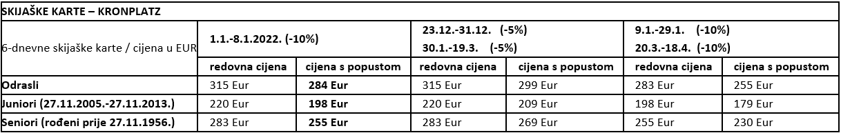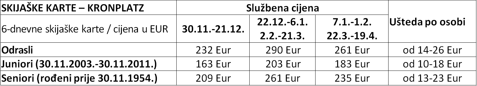 Cjelodnevna škola skijanja za djecu 6 dana (program nedjelja do četvrtak – škola skijanja 10:00 – 13:00, ručak i pauza pod nadzorom do 14:00, slobodno skijanje uz nadzor učitelja; program petak – škola skijanja 10:00 – 13:00 zbog proglašenja i podjela nagrada. Ručak uključen u cijenu.)