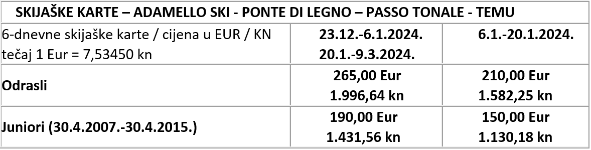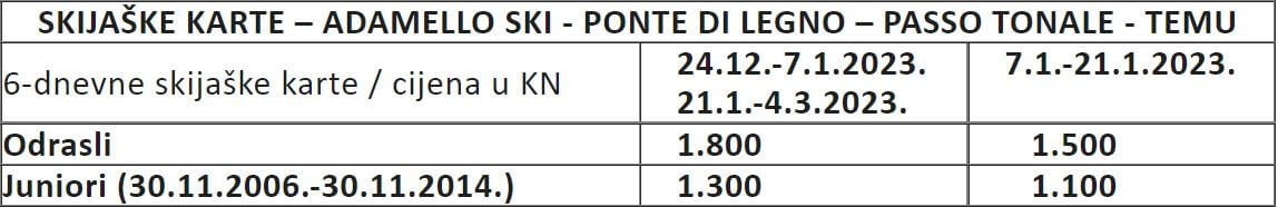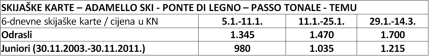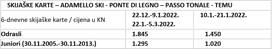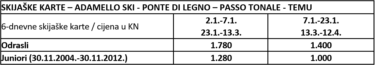Doplata na licu mjesta: za Key Card 5 Eur po osobi, za osiguranje od trećih osoba (Snowcare) cca 3 Eur po osobi i danu. Napomena: karte podižete uz predočenje vouchera na blagajni gondole. Fotografija za ski karte nije potrebna. Obavezno predočiti putovnicu zbog ostvarivanja prava na korištenje ski karte za juniore, seniore i djecu.