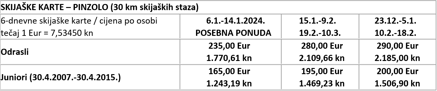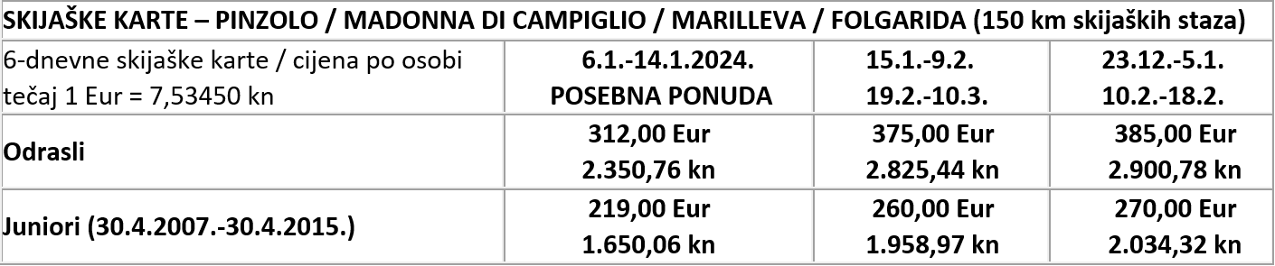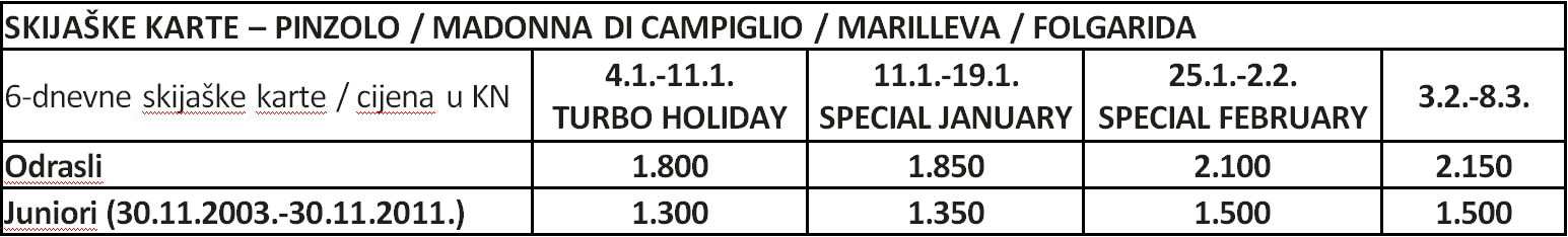 Napomena: u slučaju znatnijeg povećanja troškova energije, postoji mogućnost povećanja cijene skijaških karata od strane žičara. Zadržavamo pravo na promjenu cijene i doplatu. Ski karte podižete uz predočenje vouchera na blagajni žičare u mjestu Pinzolo. Obavezno predočiti putovnicu zbog ostvarivanja prava na korištenje ski karte za juniore i djecu.